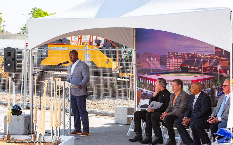 Creighton University broke ground yesterday for its baseball practice field and celebrated construction progress on its softball stadium.